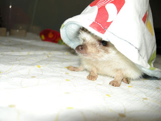 Mom is always amazed and amused when she watches Huey during play time. Huey definitely does not let it be known that he has no sight. One would never know he is blind by watching him run around in his play pen. He explores for about 10 seconds before he maps out his route and runs the exact same path over and over until he gets bored and then switches it up a little. He runs non stop, as fast as he can. Unless mom stays up really really late and hides in the dark she doesn't get to see Horatio or I play, however......... Huey is a totally different story!! As Huey can't differentiate between day and night (light and darkness) he is active whenever his little heart pleases. This often means he is active right when mom and dad get up and then again in the evening when mom and dad get home. He puts on quite an impressive show. He loves his wheel, but he is a very cautious wheel runner, so his pace is a little on the slow side (therefore he has a rounder bottom than the rest of us). On solid ground though, he's faster than as a speeding bullet.... OK, sort of! Here's some shots of him getting away!!